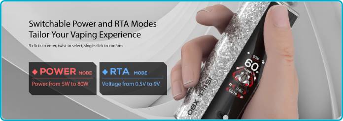 - Le mode RTA : ce mode d'utilisation est réservé à l'utilisation d'un atomiseur reconstructible. Il permet de régler le voltage de votre box en fonction de vos préférences de vapotage.